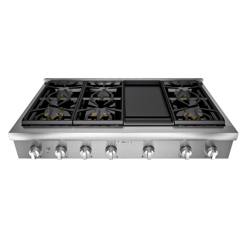 Parrilla Gas Profesional 48" (120 cm) Marca: Thermador Modelo: PCG486WD Color: Acero Inoxidable Acero Inoxidable 6 Quemadores Quemadores Pedestal Star Superficie de Porcelana Plancha Eléctrica 12" Control en Perillas Perillas Frontales