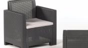 Sala de Exterior Moldeada en Plástico (3-1-1) Modelo: ALABAMA TRIPLE Color: Gris Oscuro / Chocolate Set Nevada para Exterior 1 Sillón Triple 2 Sillones Individuales 1 Mesa de Centro Incluye Cojines