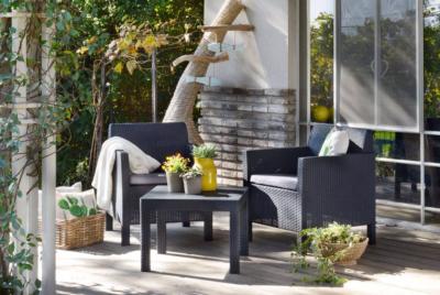 Sala Set Piezas EMMA BALCONY Marca: KETER Modelo: 17209484 Color: Gris Oscuro 2 Sillones Individuales 1 Mesa de Centro 2 Cojines de Poliéster